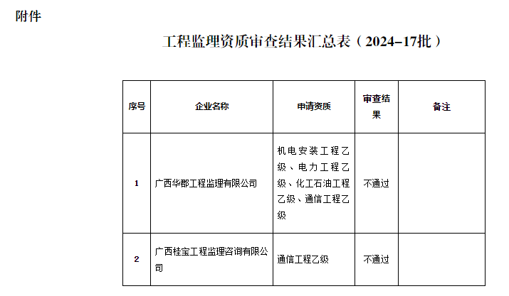 2024年5月21日广西住建厅发布了《关于公布2024年第17批工程监理资质审查结果的通告》,此次通告2家监理企业,具体名单如下: